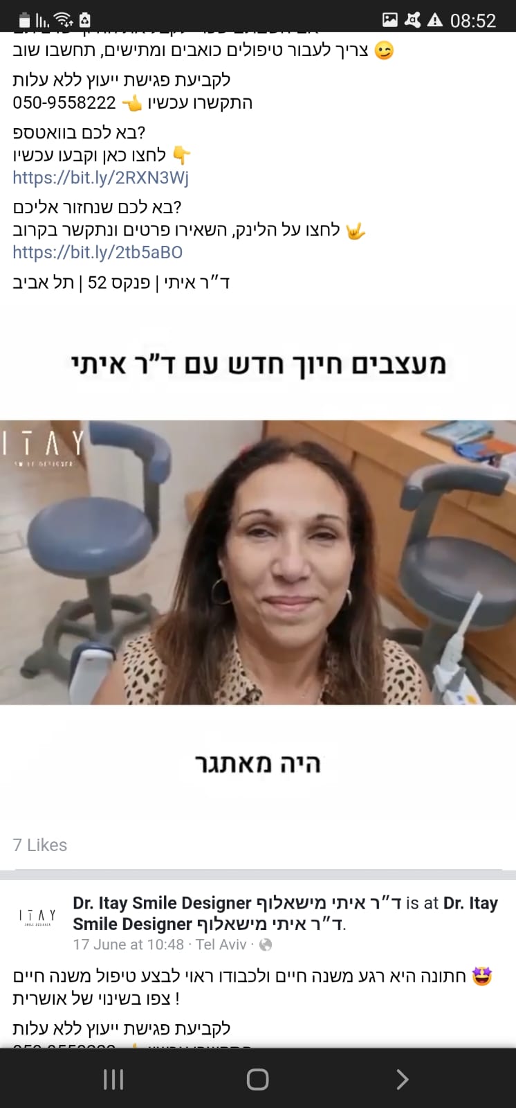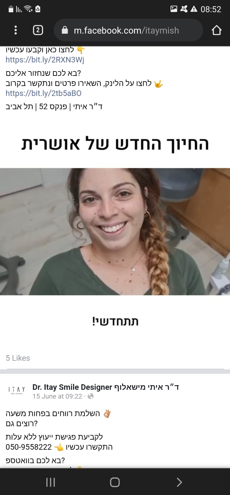במרפאה של ד“ר איתי מישאלוף תקבלו יחס חם ואוהב, שירות אדיב וכמובן מקצועיות מעל הכל. למעלה מ-60 ביקורות, כולם עם ציון של 5/5 כוכבים, אלפי לקוחות מרוצים וניסיון רב, הפכו את ד“ר איתי מישאלוף לרופא המבוקש ביותר בישראל בתחום האסתטיקה של חלל הפה.