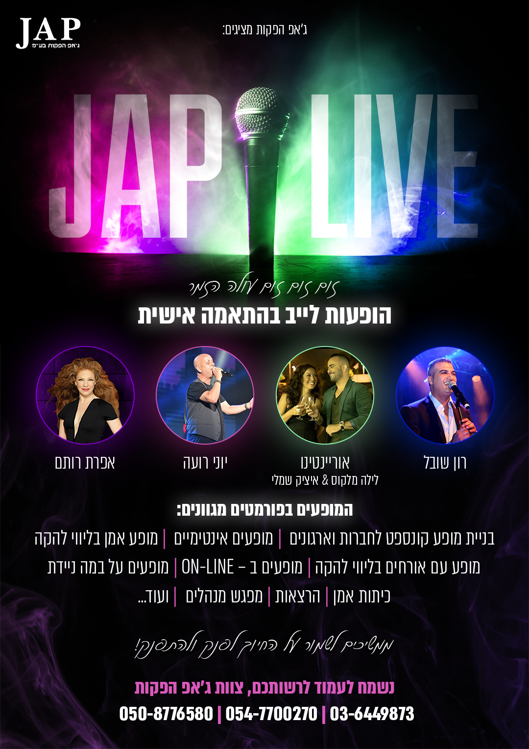 ג'אפ הפקות מתמחה ביזמות והפקה אומנותית של אירועים בלתי נשכחים וייצוג אמנים מן השורה הראשונה.